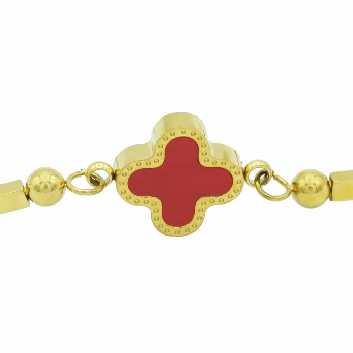 Das Klee Armband Scarlet Charm von DEES JEWELRY besticht durch seinen kräftigen roten Stein, der Liebe, Energie und Selbstbewusstsein symbolisiert. Die warme Goldveredelung verstärkt den edlen Charakter des Schmuckstücks. Die Edelstahl-Basis gewährleistet Stabilität und Langlebigkeit, sodass das Armband seinen Glanz über Jahre hinweg behält.